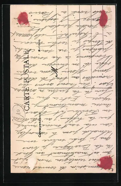 Personenbezogene Daten auf der Rückseite der Karte wurden durch blauen Textmarker unkenntlich gemacht. Die blauen Stellen sind auf die Vorderseite durchgeweicht und wirken sich negativ auf das Postkartenfoto aus