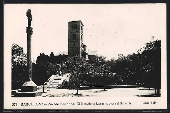 AK Barcelona, Pueblo Espanol, El Monasterio Románico desde el Baluarte