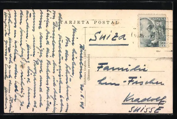 Personenbezogene Daten auf der Rückseite der Karte wurden durch blauen Textmarker unkenntlich gemacht. Die blauen Stellen sind auf die Vorderseite durchgeweicht und wirken sich negativ auf das Postkartenfoto aus