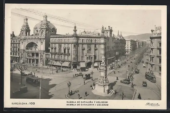 AK Barcelona, Rambla de Cataluna y Coliseum, Strassenbahn