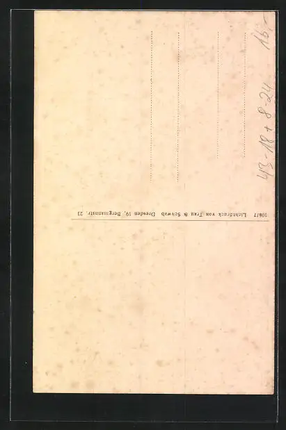 Personenbezogene Daten auf der Rückseite der Karte wurden durch blauen Textmarker unkenntlich gemacht. Die blauen Stellen sind auf die Vorderseite durchgeweicht und wirken sich negativ auf das Postkartenfoto aus