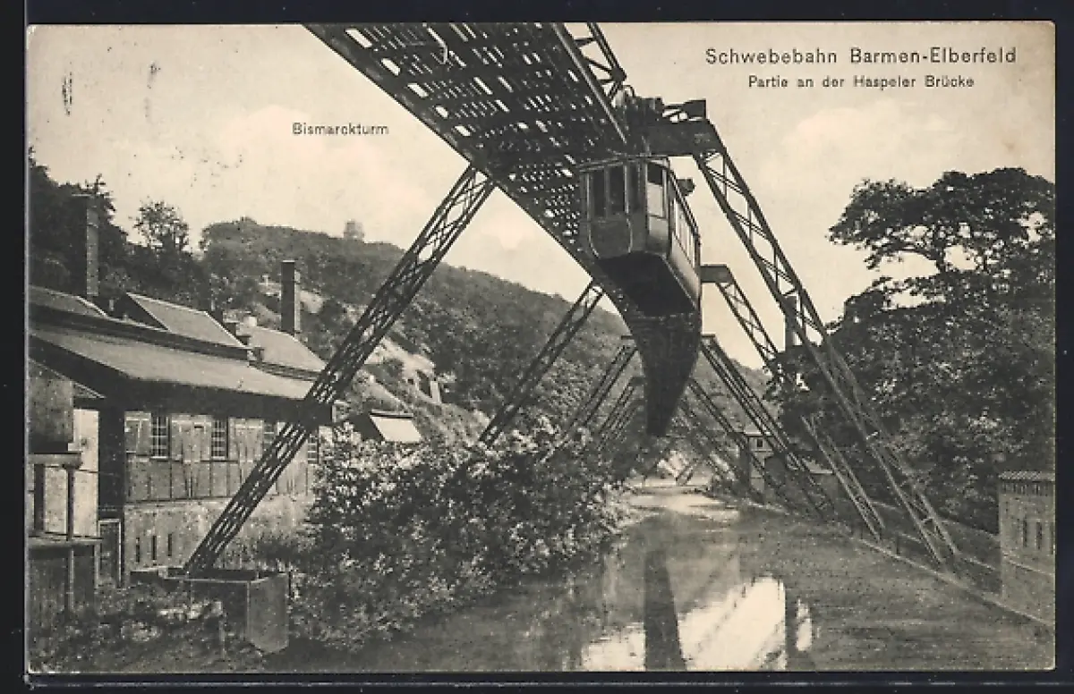 AK Barmen-Elberfeld, Partie an der Haspelerbrücke, Bismarckturm, Schwebebahn