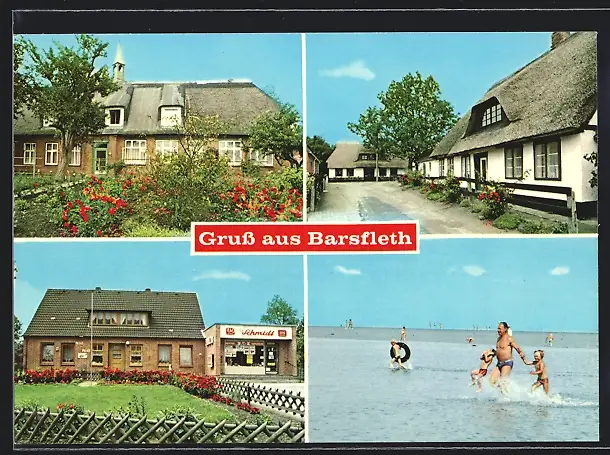 AK Barsfleth, Strohgedeckte Häuser, Schmidt Gemischtwaren, Badegäste