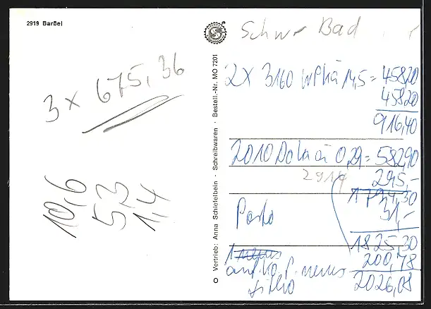 Personenbezogene Daten auf der Rückseite der Karte wurden durch blauen Textmarker unkenntlich gemacht. Die blauen Stellen sind auf die Vorderseite durchgeweicht und wirken sich negativ auf das Postkartenfoto aus