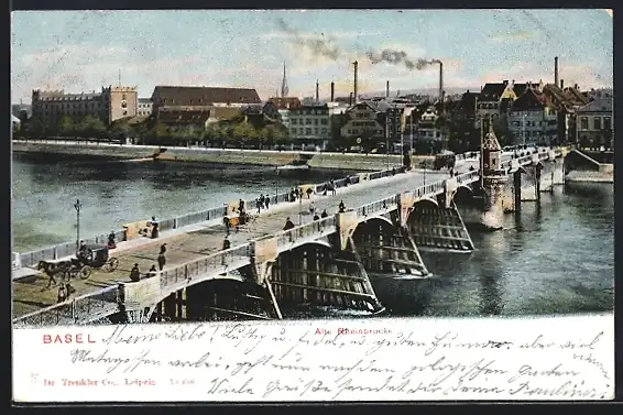 AK Basel, Alte Rheinbrücke mit Strassenbahn