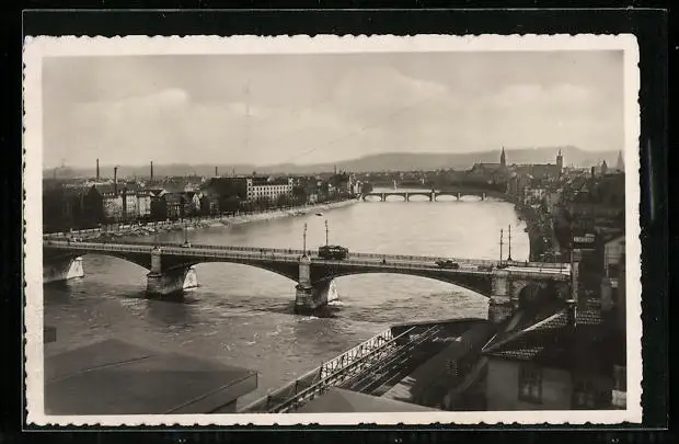 AK Basel, Die Drei Rheinbrücken, Strassenbahn
