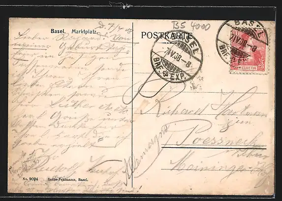 gelaufen 1908, Eckknick re. oben, rückseitig Oberflächenschaden, guter Zustand