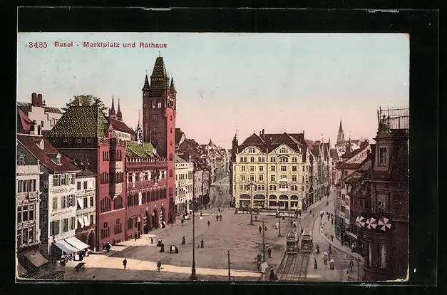AK Basel, Marktplatz und Rathaus mit Strassenbahn