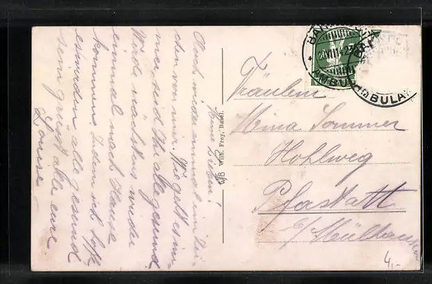 Personenbezogene Daten auf der Rückseite der Karte wurden durch blauen Textmarker unkenntlich gemacht. Die blauen Stellen sind auf die Vorderseite durchgeweicht und wirken sich negativ auf das Postkartenfoto aus