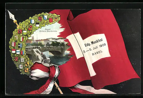 AK Basel, Mittlere Rheinbrücke, Wappen & Flagge, Passepartout