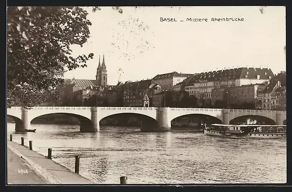 AK Basel, Mittlere Rheinbrücke mit Kirche