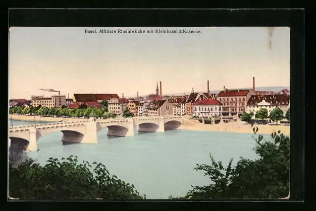 AK Basel, Mittlere Rheinbrücke mit Kleinbasel und Kaserne