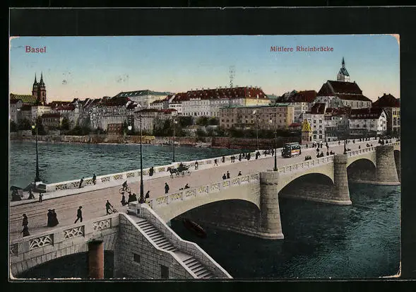 AK Basel, Mittlere Rheinbrücke mit Strassenbahn