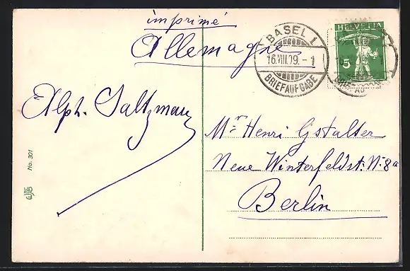 Personenbezogene Daten auf der Rückseite der Karte wurden durch blauen Textmarker unkenntlich gemacht. Die blauen Stellen sind auf die Vorderseite durchgeweicht und wirken sich negativ auf das Postkartenfoto aus