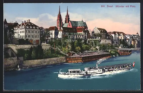 AK Basel, Münster mit Pfalz, Dampfer auf dem Rhein