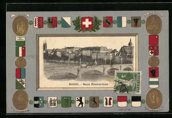AK Basel, Neue Rheinbrücke, Wappen, Telldenkmal
