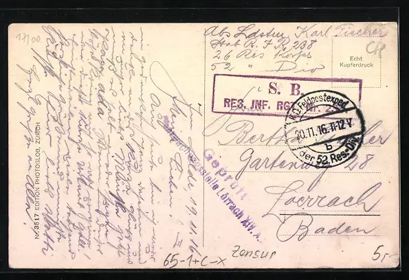 Personenbezogene Daten auf der Rückseite der Karte wurden durch blauen Textmarker unkenntlich gemacht. Die blauen Stellen sind auf die Vorderseite durchgeweicht und wirken sich negativ auf das Postkartenfoto aus
