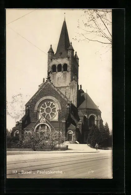 AK Basel, Pauluskirche mit Strasse