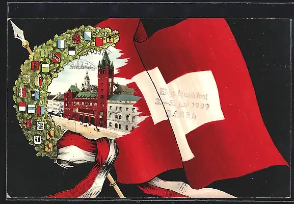 AK Basel, Rathaus, Wappen der Kantone, Schweizer Fahne