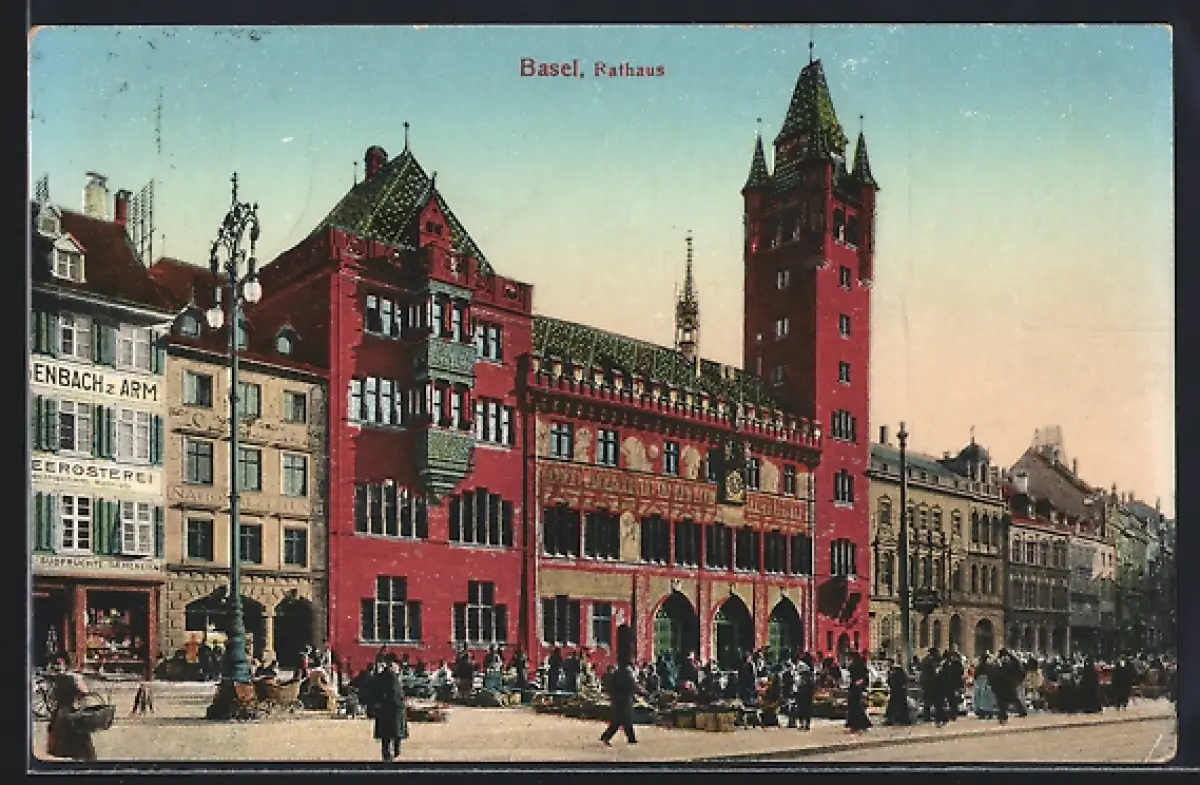 AK Basel, Rathaus mit Marktbetrieb, Panorama