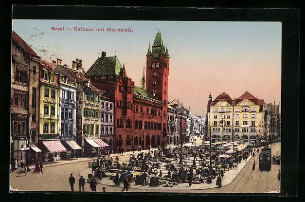 AK Basel, Rathaus mit Marktplatz, Strassenbahn