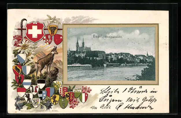AK Basel, Rheinansicht, Kantonswappen