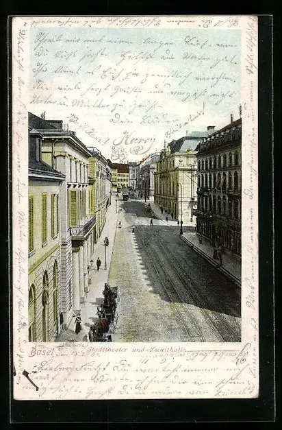 AK Basel, Stadttheater und Kunsthalle mit Strassenbahn