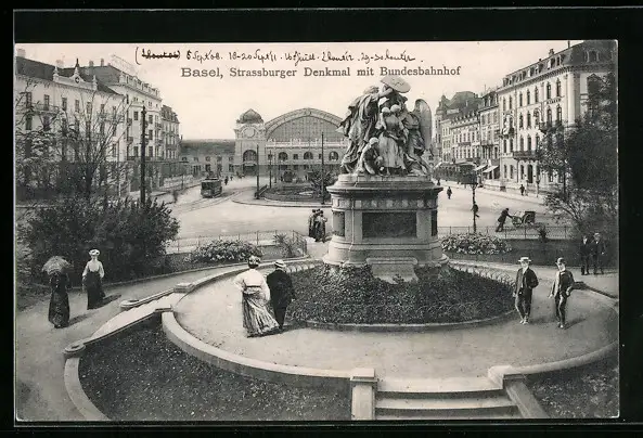 AK Basel, Strassburger-Denkmal mit Bundesbahnhof