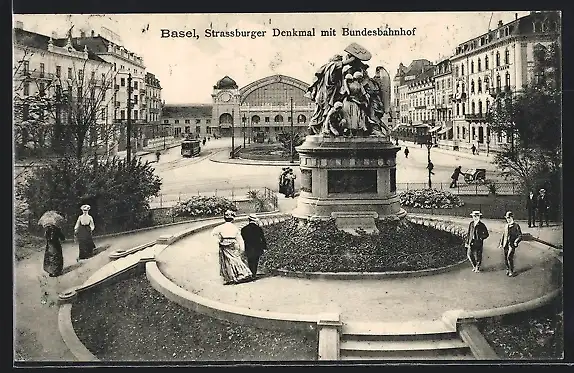 AK Basel, Strassburger-Denkmal mit Bundesbahnhof