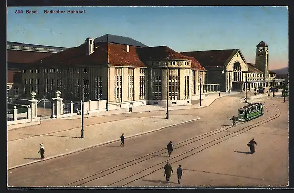 AK Basel, Strassenbahn am Badischen Bahnhof
