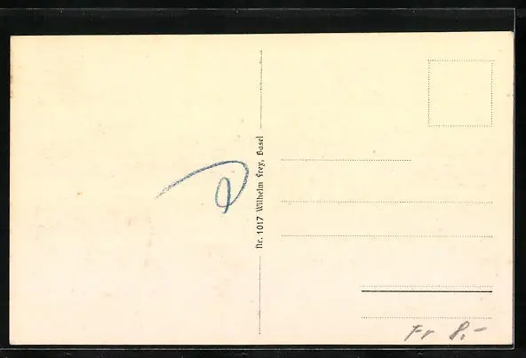 Personenbezogene Daten auf der Rückseite der Karte wurden durch blauen Textmarker unkenntlich gemacht. Die blauen Stellen sind auf die Vorderseite durchgeweicht und wirken sich negativ auf das Postkartenfoto aus