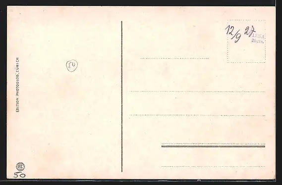 Personenbezogene Daten auf der Rückseite der Karte wurden durch blauen Textmarker unkenntlich gemacht. Die blauen Stellen sind auf die Vorderseite durchgeweicht und wirken sich negativ auf das Postkartenfoto aus