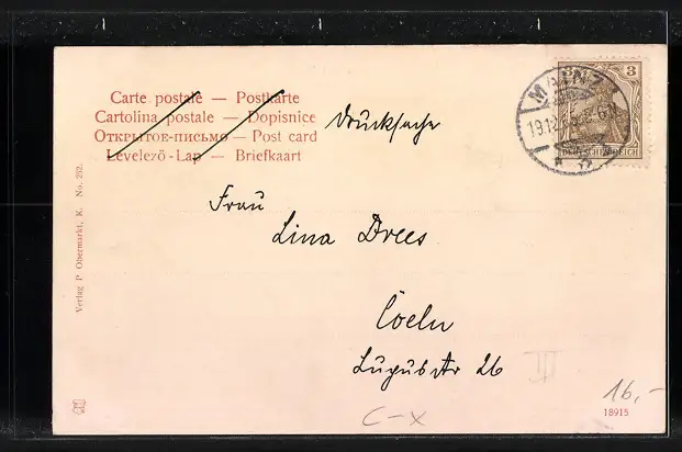 Personenbezogene Daten auf der Rückseite der Karte wurden durch blauen Textmarker unkenntlich gemacht. Die blauen Stellen sind auf die Vorderseite durchgeweicht und wirken sich negativ auf das Postkartenfoto aus