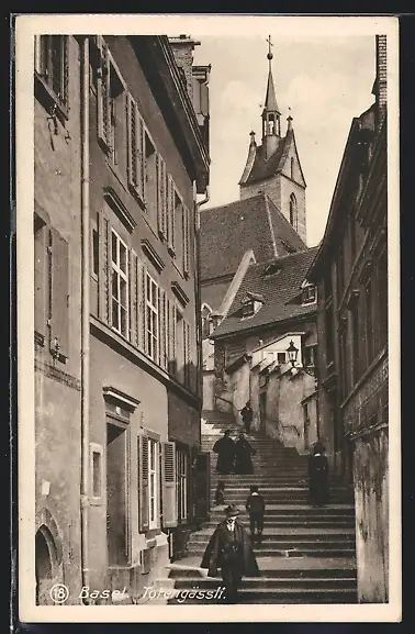 AK Basel, Totengässli mit Leuten auf den Stufen