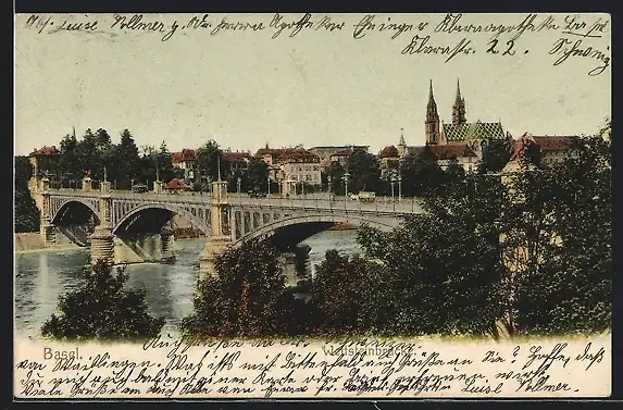 AK Basel, Wettsteinbrücke, Im Hintergrund Kirche