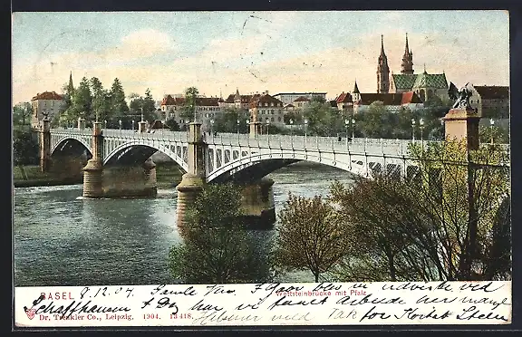 AK Basel, Wettsteinbrücke mit Pfalz