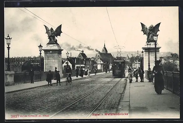 AK Basel, Wettsteinbrücke mit Strassenbahn