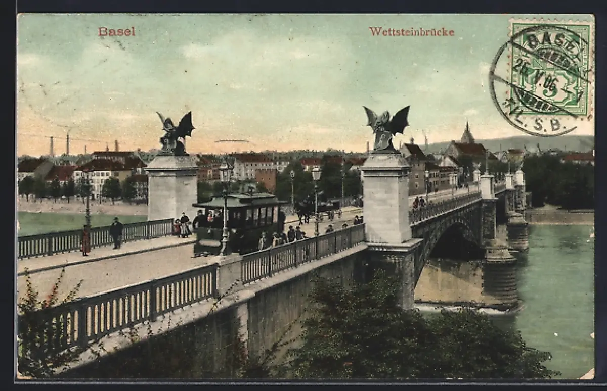AK Basel, Wettsteinbrücke mit Strassenbahn