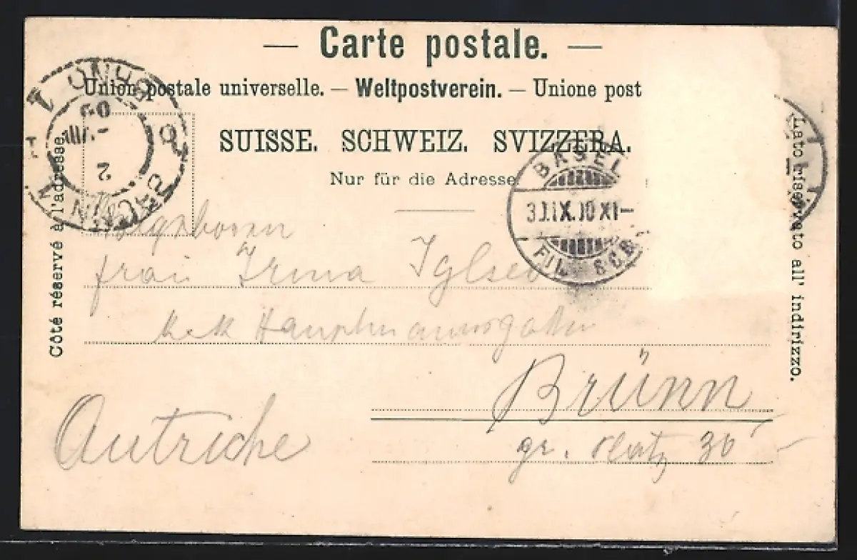 gelaufen 1900, Briefmarke entfernt, rückseitig Oberflächenschaden, Eckknick re. oben, Stempelspur, guter Zustand