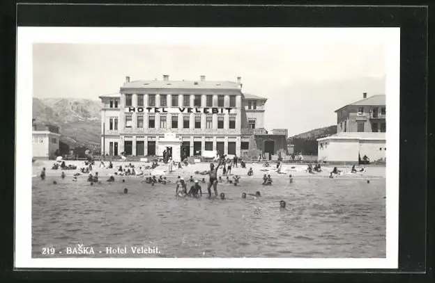 AK Baska, Hotel Velebit, Strand mit Badegästen