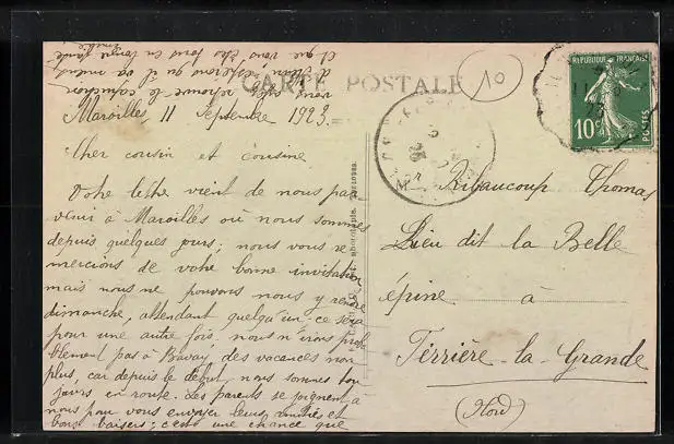 Personenbezogene Daten auf der Rückseite der Karte wurden durch blauen Textmarker unkenntlich gemacht. Die blauen Stellen sind auf die Vorderseite durchgeweicht und wirken sich negativ auf das Postkartenfoto aus