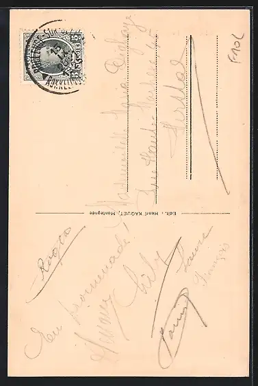 Personenbezogene Daten auf der Rückseite der Karte wurden durch blauen Textmarker unkenntlich gemacht. Die blauen Stellen sind auf die Vorderseite durchgeweicht und wirken sich negativ auf das Postkartenfoto aus