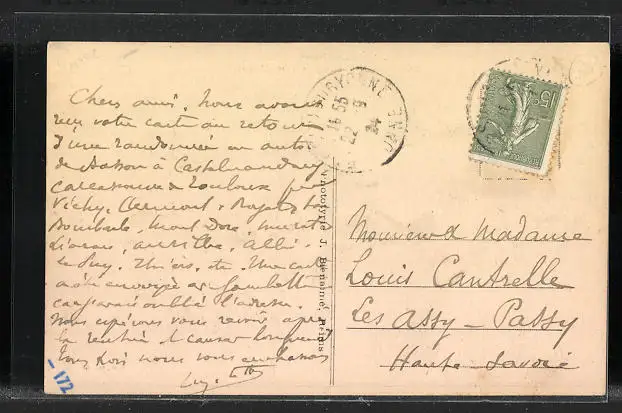 Personenbezogene Daten auf der Rückseite der Karte wurden durch blauen Textmarker unkenntlich gemacht. Die blauen Stellen sind auf die Vorderseite durchgeweicht und wirken sich negativ auf das Postkartenfoto aus