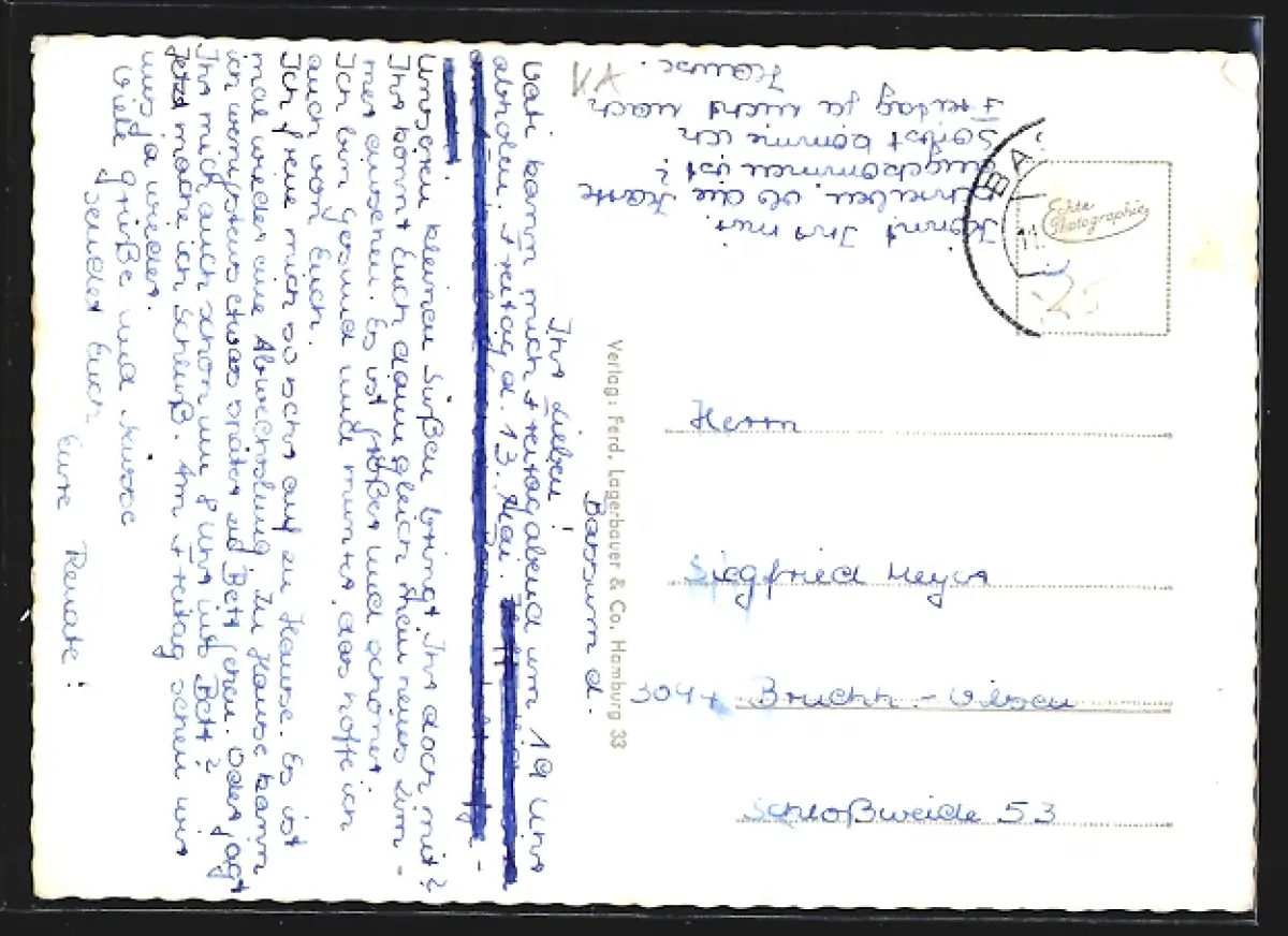 Personenbezogene Daten auf der Rückseite der Karte wurden durch blauen Textmarker unkenntlich gemacht. Die blauen Stellen sind auf die Vorderseite durchgeweicht und wirken sich negativ auf das Postkartenfoto aus