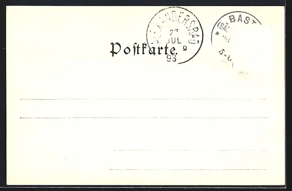 Personenbezogene Daten auf der Rückseite der Karte wurden durch blauen Textmarker unkenntlich gemacht. Die blauen Stellen sind auf die Vorderseite durchgeweicht und wirken sich negativ auf das Postkartenfoto aus