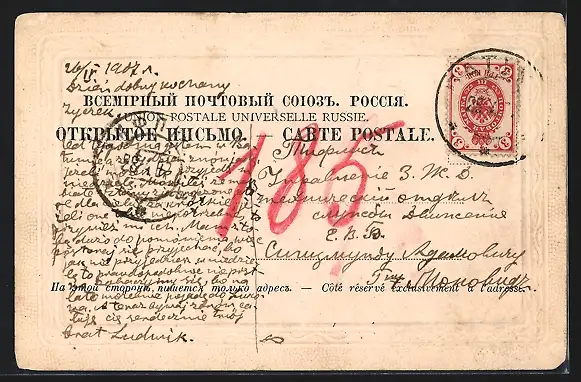 Personenbezogene Daten auf der Rückseite der Karte wurden durch blauen Textmarker unkenntlich gemacht. Die blauen Stellen sind auf die Vorderseite durchgeweicht und wirken sich negativ auf das Postkartenfoto aus