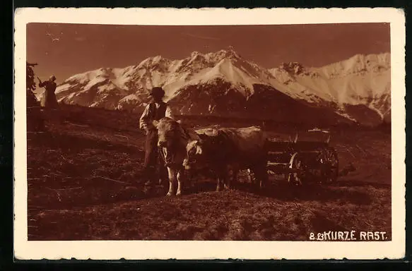 AK Bauer mit Ochsen-Gespann in den Bergen