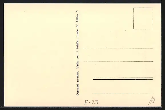 Personenbezogene Daten auf der Rückseite der Karte wurden durch blauen Textmarker unkenntlich gemacht. Die blauen Stellen sind auf die Vorderseite durchgeweicht und wirken sich negativ auf das Postkartenfoto aus