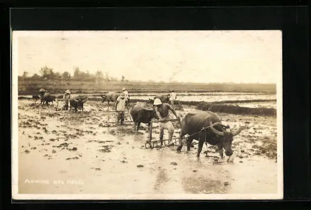 AK Bauern mit Gespann im Reisfeld