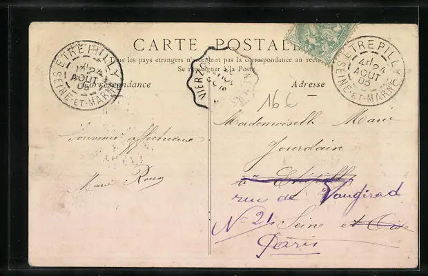Personenbezogene Daten auf der Rückseite der Karte wurden durch blauen Textmarker unkenntlich gemacht. Die blauen Stellen sind auf die Vorderseite durchgeweicht und wirken sich negativ auf das Postkartenfoto aus